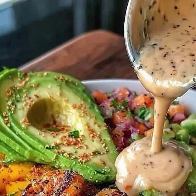 A delicious and vibrant bowl featuring shrimp, avocado, and a refreshing mango salsa, topped with a zesty lime-chili sauce.