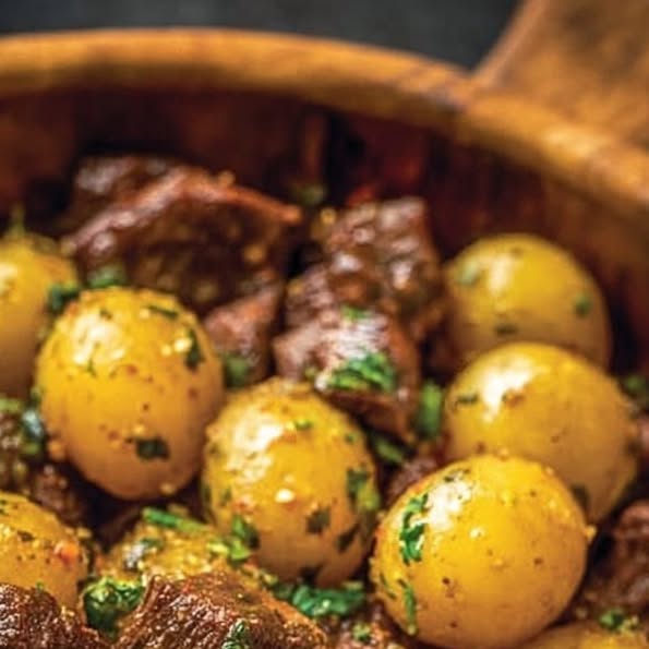 A hearty dish featuring tender beef stew meat and baby potatoes in a flavorful garlic butter sauce.